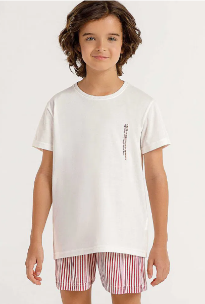 Pijama Cor Com Amor Manga curta Infantil , feita de malha de algodão na cor talco a blusa, apresenta uma estampa localizada na lateral esquerda de quem veste, adicionando um toque de estilo e personalidade à peça. A bermuda complementa o conjunto com uma estampa rotativa de listras vermelhas sobre um fundo talco, mantendo uma harmonia visual. Com uma cintura de elástico de 3 cm e modelagem tradicional, oferece conforto e liberdade de movimento durante toda a noite.